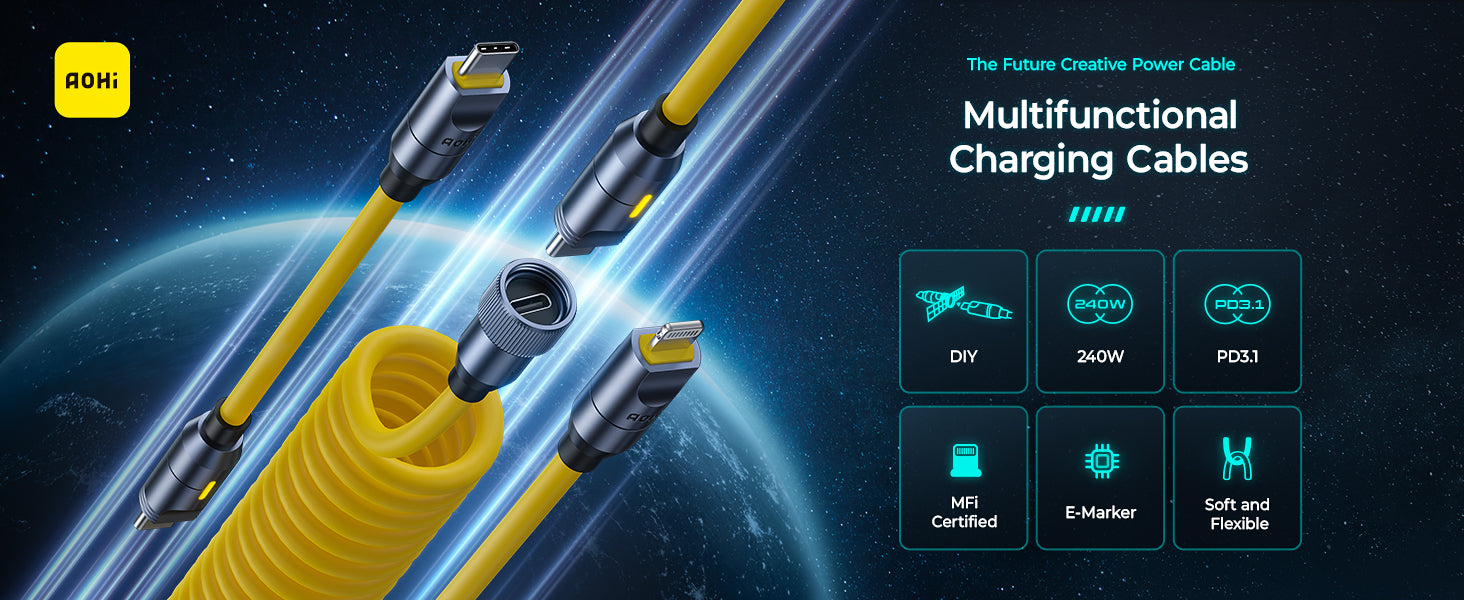 - Blazing-Fast Power Delivery: Compared to normal 60W/100W fast charging cables, AOHi The Future Creative Power Cable Set is compatible with USB-C 240W PD3.1 lightning-fast charging, giving you the freedom to charge phones, laptops, and other devices.