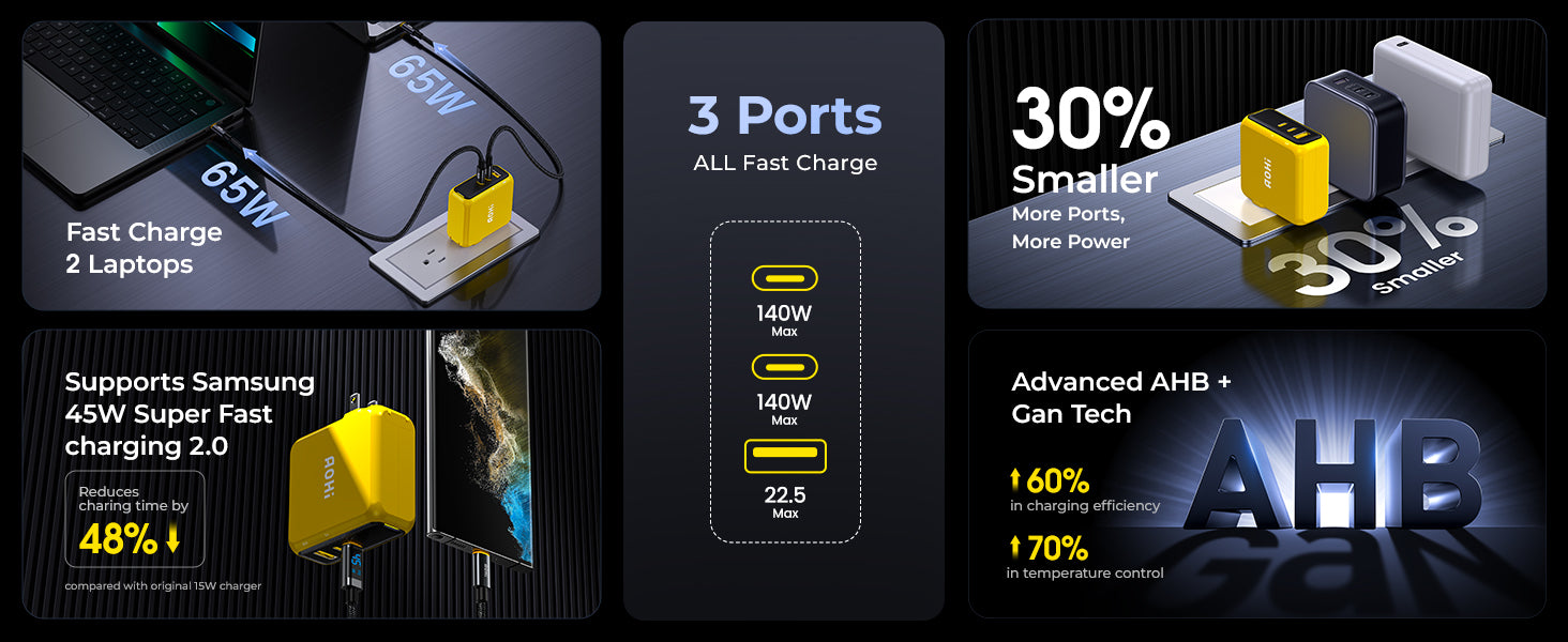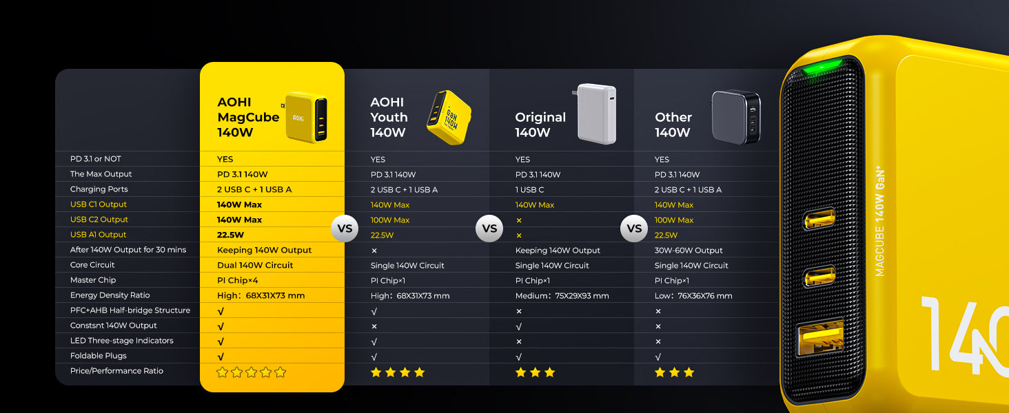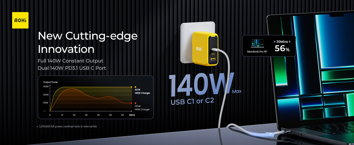 Enjoy Cutting-edge Innovation: AOHI 140W PD3.1 USB-C charger is the first one that can maintain 140W output to keep your device at a stable and constant fast charging status. Both USB-C ports can support 140W fast charging for Macbook Pro 16". Also the best companion for the latest iPhone 17 series. It's a true game changer, delivering the most realistic 140W output charging solution in the industry.