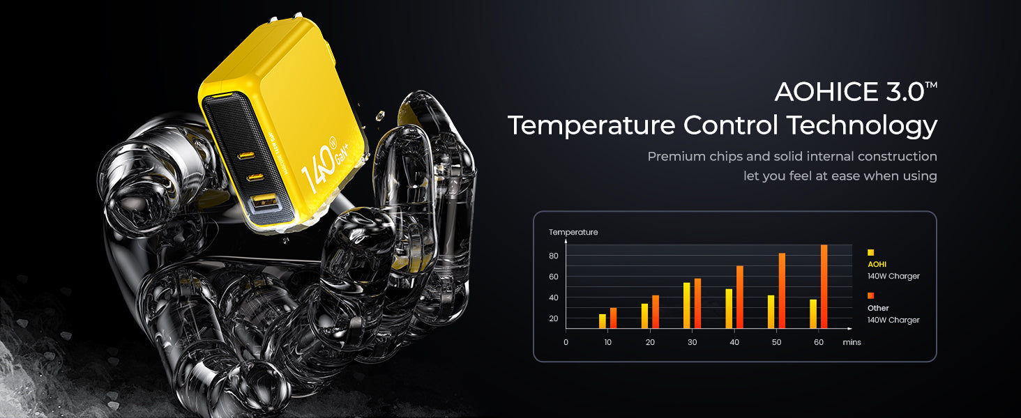 - Low-temperature Design: Newly upgraded AOHICE 3.0 temperature control technology, this 140W fast charger has passed 1,070,000 full power overload tests, supports high power output while real-time temperature control and rapid heat dissipation, safeguarding your devices from overheating.It also means long-term longevity and safety for your charger.